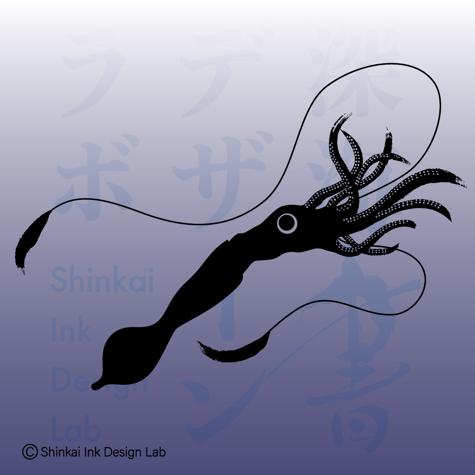 ゆらゆらと幽霊のように漂うユウレイイカ。その姿はまるで深海の幽霊のようで、神秘的な雰囲気を醸し出しています。ユウレイイカの触腕の先には発光器があり、暗い海の中で淡い光を放ちます。発光器と足を筆で描き、このイカの不可思議な存在を表現しました。
